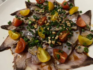 塩を振り水分を出してから、昆布と酢で締めたさばをスモークしました。
