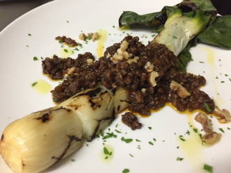 下仁田ネギを一本丸ごとローストして、甘みを引き出しております。相性抜群の鴨のひき肉を八丁味噌で煮込んだソースでお召し上がりください!!